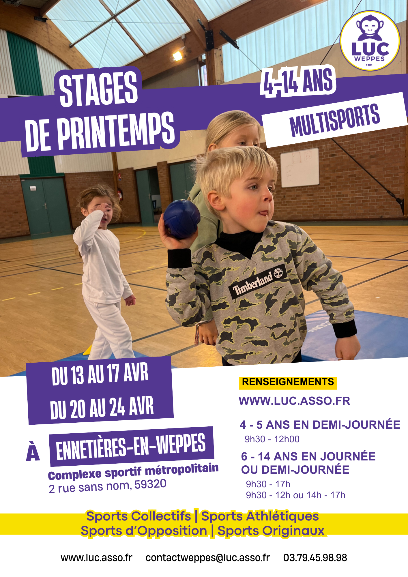 Printemps : 13/04/26 au 17/04/26 (5jours) et du 20/04/26 au 24/04/26 (5jours)